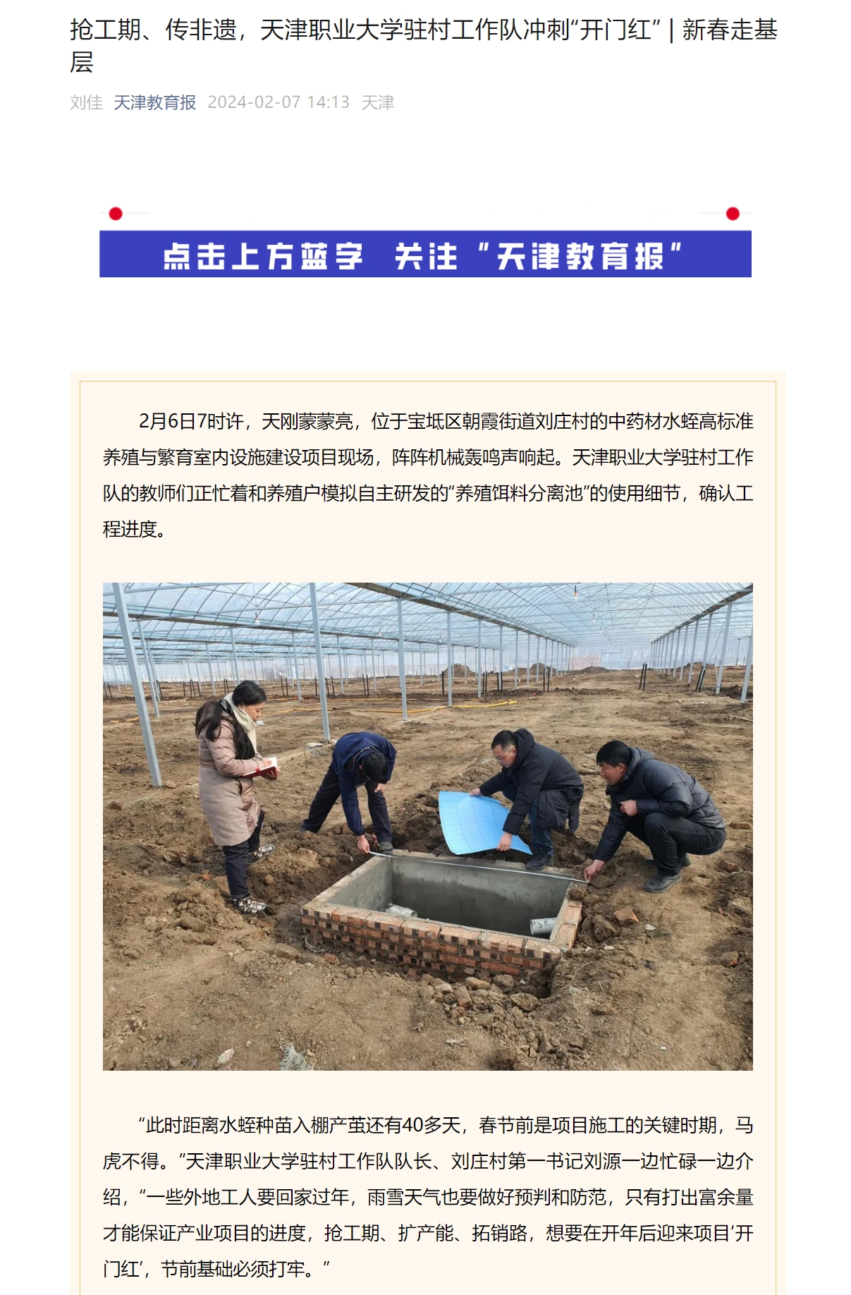 2月6日7时许,天刚蒙蒙亮,位于宝坻区朝霞街道刘庄村的中药材水蛭高标准养殖与繁育室内设施建设项目现场,阵阵机械轰鸣声响起。beat365中文唯一官网驻村工作队的教师们正忙着和养殖户模拟自主研发的“养殖饵料分离池”的使用细节,确认工程进度。
