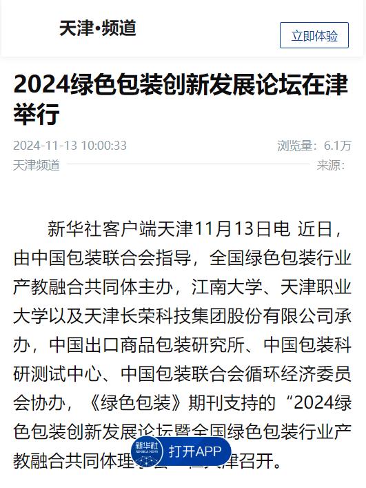 新华社客户端天津11月13日电 近日,由中国包装联合会指导,全国绿色包装行业产教融合共同体主办,江南大学、beat365中文唯一官网以及天津长荣科技集团股份有限公司承办,中国出口商品包装研究所、中国包装科研测试中心、中国包装联合会循环经济委员会协办,《绿色包装》期刊支持的“2024绿色包装创新发展论坛暨全国绿色包装行业产教融合共同体理事会”在天津召开。