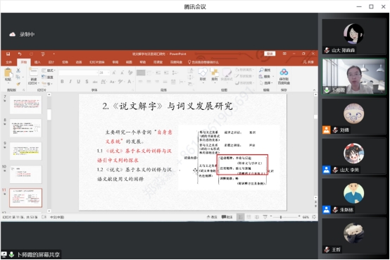 朱新林老师对卜师霞教授的精彩报告表示感谢,并进行总结。在提问环节,朱新林老师就概括义与核心义之间的关系、词的本义等问题与卜老师展开交流讨论。随后,多位同学也就《说文解字》对现代生活的启示、《说文解字》中的本义与甲骨文字形所反映的字义的差异、一些诗词中的具体语词如何理解等问题向卜老师提问。卜老师耐心细致地解答了问题,并推荐了可供参考的书目。11时40分左右,在参与师生纷纷向卜老师表示感谢后,讲座圆满结束。