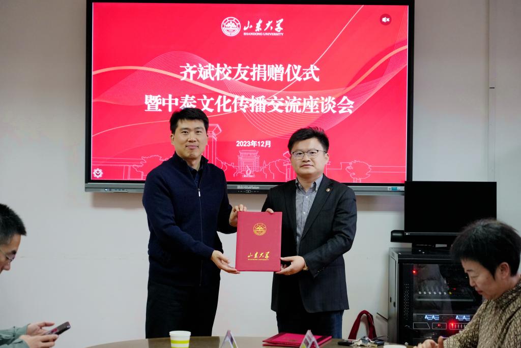 仪式上,顾炜为齐斌校友颁发捐赠证书。据悉,为进一步推动中泰文化传播交流、拓宽学院教学科研领域、提升国际化办学水平,近日,齐斌校友向pp电子游戏平台官网捐赠10万元善款,用于支持学院人才培养、国际化办学,助力学院高质量发展。