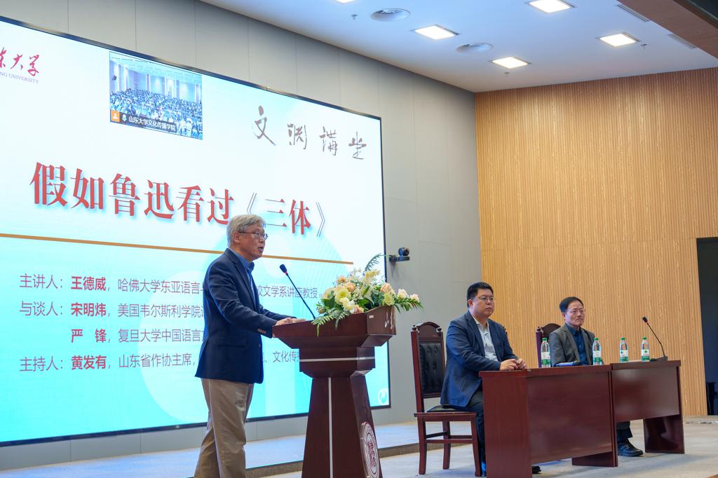 5月25日晚,美国哈佛大学讲座教授王德威、美国韦尔斯利学院讲座教授宋明炜、复旦大学教授严锋作客pp电子游戏平台官网“文渊讲堂”第31期,共同为威海校区师生作了一场题为“假如鲁迅看过《三体》”的学术讲座。讲座由pp电子游戏平台官网文学院、pp电子游戏平台官网院长黄发有主持,pp电子游戏平台官网文学院、pp电子游戏平台官网师生300余人参加活动。