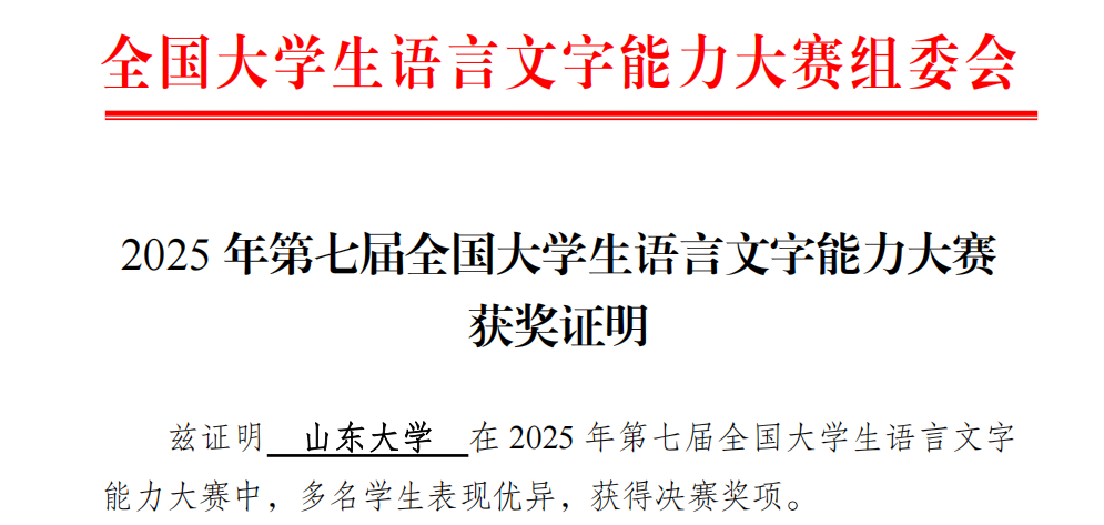 近日,2025年第七届全国大学生语言文字能力大赛组委会公布决赛比赛结果,我校共63人入围全国总决赛,其中9人荣获全国一等奖,16人荣获全国二等奖,12人荣获全国三等奖,获奖率超50%,获奖人数和等次在全国参赛高校中优势明显。获奖学生分布于汉语言文学、新闻学、物理学、法学等多个专业,充分展现出山大学子优秀的语言文字应用能力与扎实的文学素养。