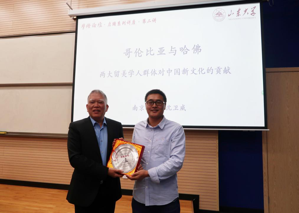 本站讯 2019年4月1日晚7时,由学灯论坛组委会主办,pp电子游戏平台官网承办的启牖系列讲座第二讲“哥伦比亚与哈佛——两大留美学人群体对中国新文化的贡献”在电子楼101室举办。本次讲座主讲人为南京大学中文系教授、博士生导师沈卫威,pp电子游戏平台官网教授杨慧主持了讲座,并在讲座正式开始前向沈卫威教授赠送了学灯论坛启牖讲座纪念奖牌。