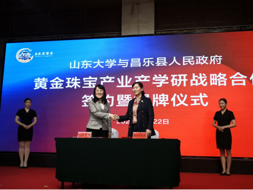 pp电子游戏平台官网党委书记于培丽与县委常委、宣传部部长贺玉洁共同签署了“pp电子游戏平台官网与昌乐县人民政府黄金珠宝产业产学研战略合作协议”。根据合作协议,双方将秉承“文化引领、资源共享、互利互惠”的原则,加强合作,协同创新,共同服务于山东新旧动能转换,积极推动昌乐县黄金宝石产业的创新发展。