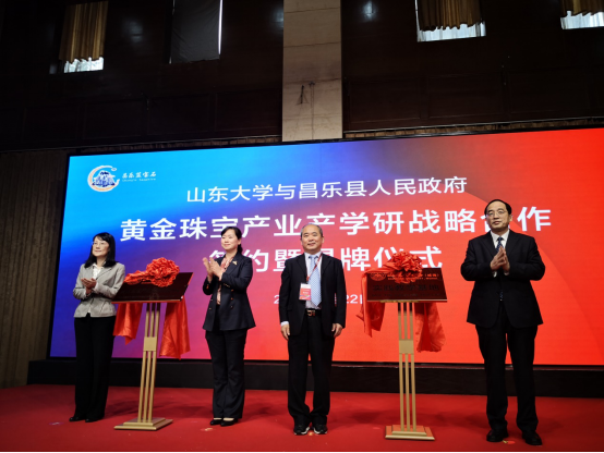 于培丽、贺玉洁、刘晓军、王在山等代表校地双方共同为“pp电子游戏平台官网黄金珠宝产业文创研发中心”“pp电子游戏平台官网(威海)实践教学基地”揭牌。