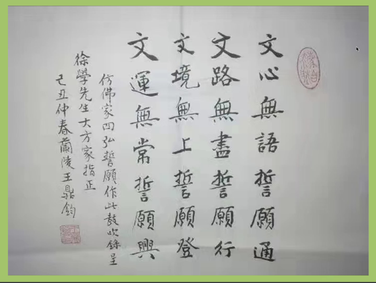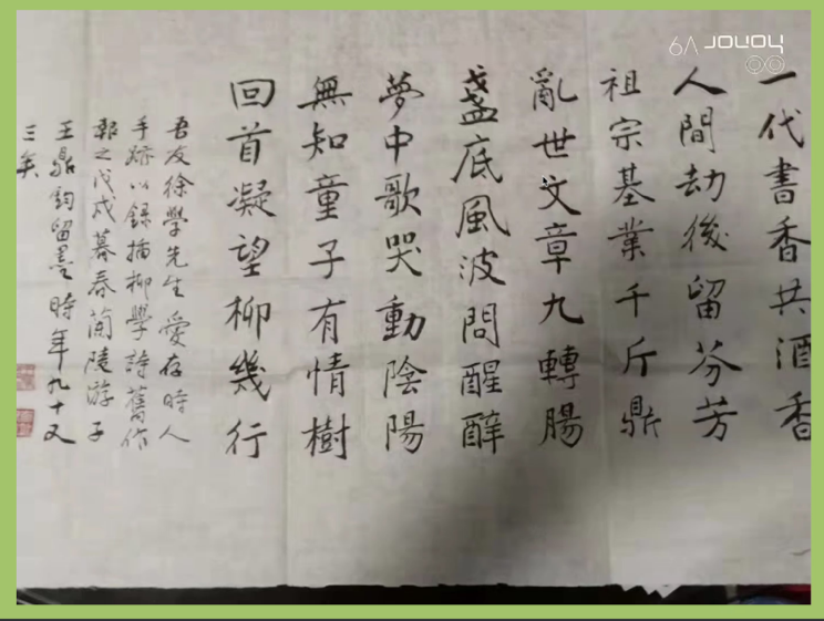 第二,王鼎钧和家乡鲁南的关系。徐教授首先结合中国人“离开故土如斩断根一样”的文化心理,分析了作家的“故乡”与宗教情怀之间深刻联系。其次他深刻剖析了王鼎钧的文学形成所受的兰陵王世家这个大家族的具体影响,其中既有大家族文化传承尤其是“诗酒传家”使其具备的深厚学养与气度,也有一个文学感受人对大家庭的肮脏之隐晦批判。王鼎钧的写作是北派“一天一地一圣人”的大气文学,也是深受荀子影响不流于空泛的“实心”文学。讲到动情之处,徐教授向同学们展示了王鼎钧93岁时亲手抄写给徐教授的两首古体诗,并结合诗的内容与笔墨之间的意气生动阐释了他对王鼎钧的家族文化基因、文学魂魄、文学境界的哲思与体悟。