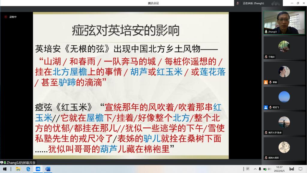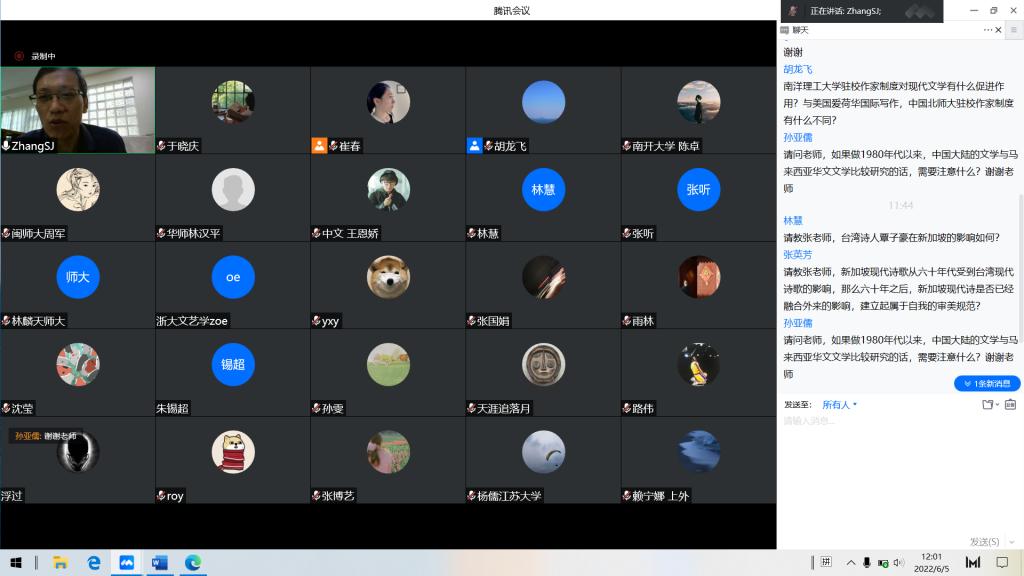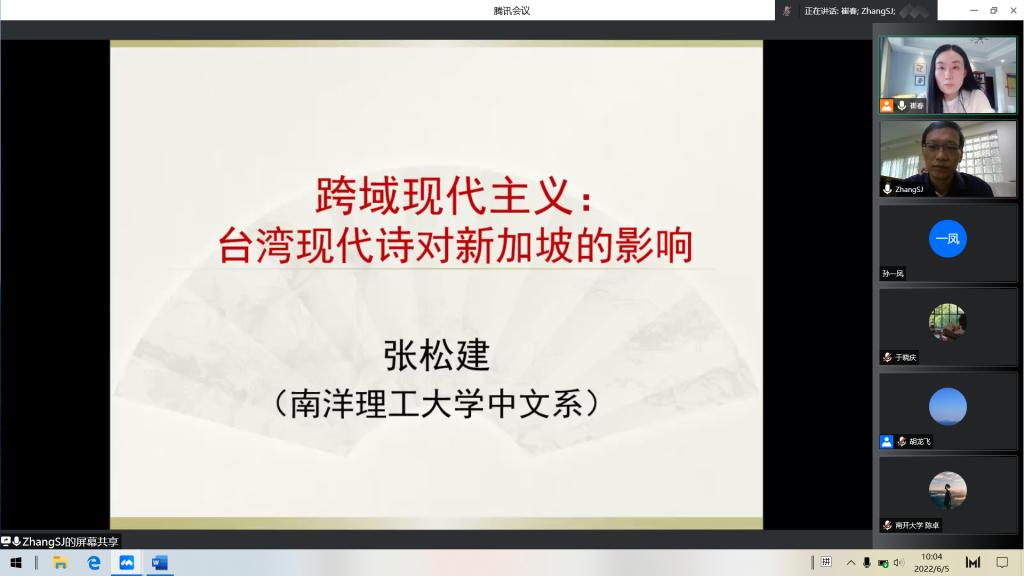 6月5日上午,南洋理工大学人文学院张松建副教授应邀做客pp电子游戏平台官网名师大讲堂,主讲题为“跨域现代主义:台湾现代诗对新加坡的影响”的学术报告。pp电子游戏平台官网崔春副教授主持报告会,来自浙江大学、南开大学和pp电子游戏平台官网一校三地等高校的近百名师生通过腾讯会议共同聆听此次报告。