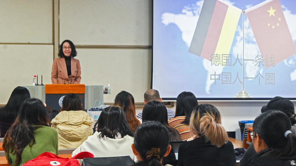 张丹红首先分享了艺术家刘杨创作的一组展现中德文化差异的漫画《Ost trifft West》,并以此串联起讲座的内容。结合刘杨的创作与自身的真实经历,张丹红讲述了从学习工作到生产生活,从日常起居到婚恋关系等方方面面中国与德国的文化差异。张丹红将中德文化的差异概括为“中国人一个圈,德国人一条线”,中国人和德国人在思维方式上千差万别。这种差异体现在企业文化上,表现为中国人与德国人在创业模式、沟通模式,以及对企业忠诚度等方面的区别。讲座中,张丹红给计划出国留学的同学提出有关餐桌礼仪和Smalltalk等方面的建议。