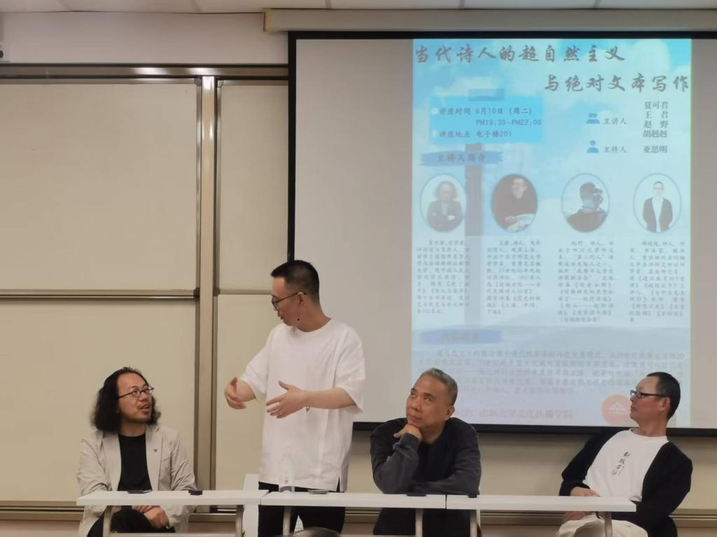 6月10日,夏可君、王君、赵野、胡赳赳应邀做客pp电子游戏平台官网名师大讲堂,为全校师生带来题为“当代诗人的超自然主义与绝对文本写作”的学术讲座。本次讲座由pp电子游戏平台官网教授崔春主持,学院师生共同聆听。