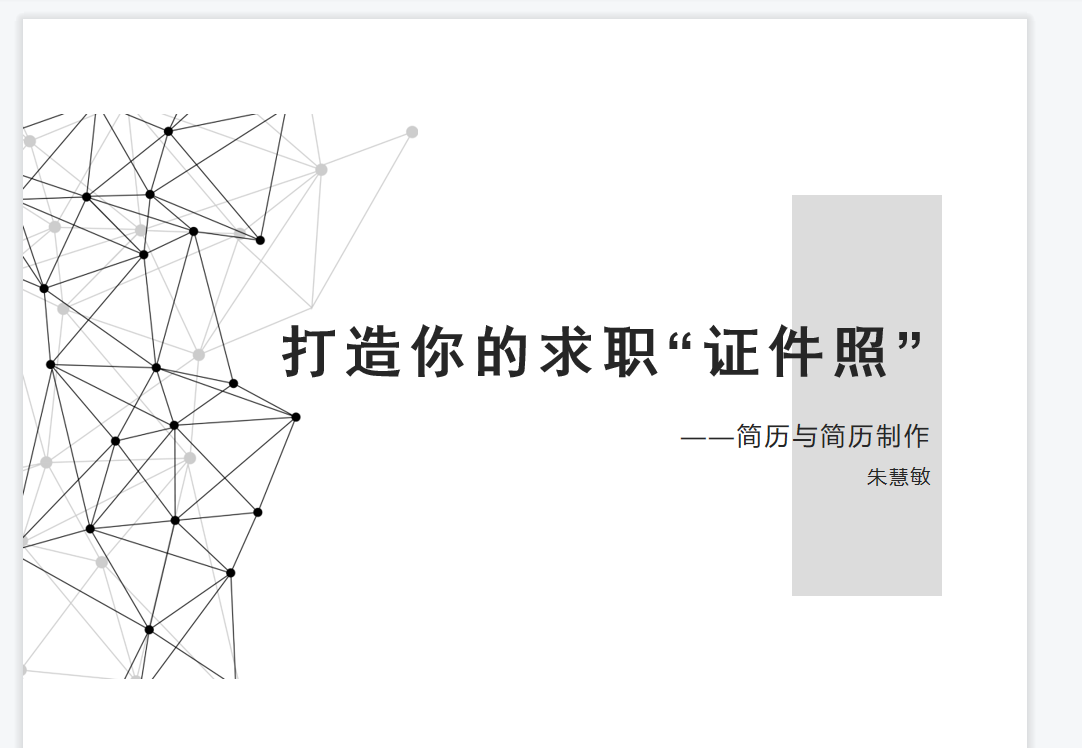 围绕打造自己的求职“证件照”,朱老师从“我是谁”“我经历了什么”“为什么选择我”入手,对简历的基本结构,简历的制作,打造自己的IP,以及提高简历回复率四个方面进行了讲解。
