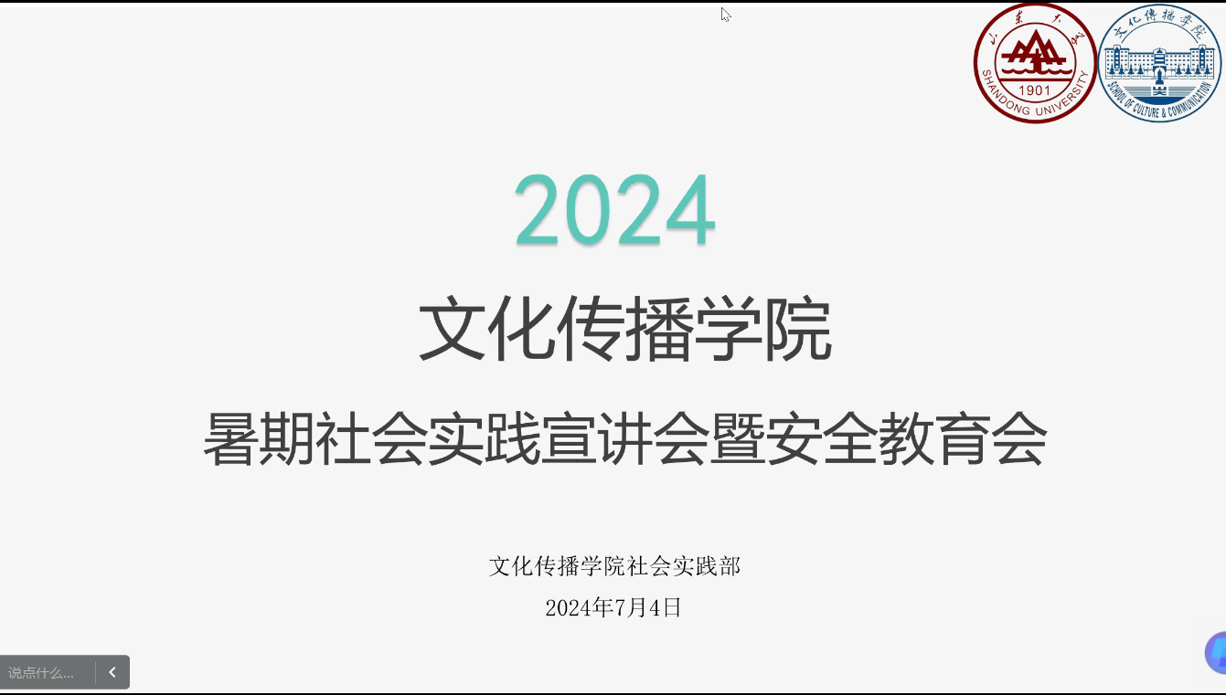 为进一步增强学生安全意识,推进pp电子游戏平台官网暑期社会实践工作顺利开展,7月4日,pp电子游戏平台官网学生会社会实践部召开2024年暑期社会实践宣讲会暨安全教育会。会议由社会实践部部长宁权主持,辅导员朱慧敏,宣讲嘉宾马诗语、李子硕,社会实践队伍全体成员及2023级学生参加会议。