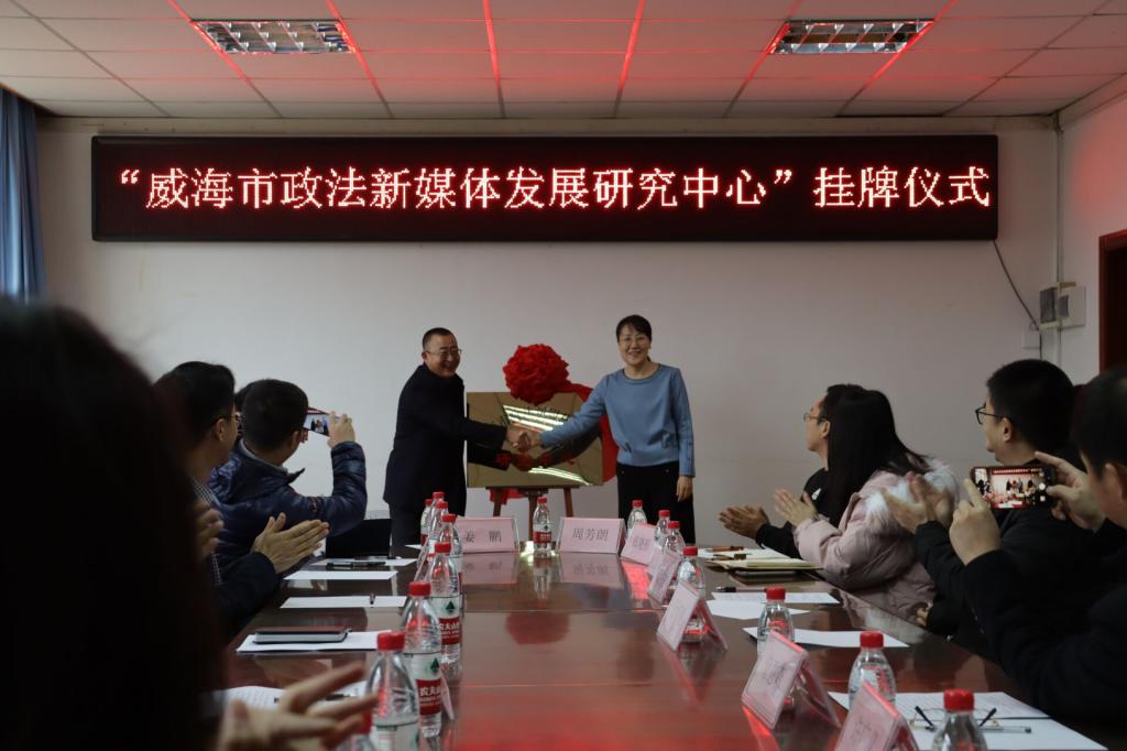 本站讯 12月25日上午,由pp电子游戏平台官网(威海)与中共威海市委政法委员会合作,pp电子游戏平台官网(威海)pp电子游戏平台官网作为执行单位共建的“威海市政法新媒体发展研究中心”在文学楼会议室举行揭牌仪式。出席本次仪式的嘉宾有市委政法委副书记于夕勇、市委政法委副县级干部王春晓,pp电子游戏平台官网党委书记于培丽、学院副院长管恩森,市委政法委宣传科负责人、新媒体工作室工作人员,市中级法院、市检察院、市公安局、市司法局负责政法宣传工作的科室负责同志,学院团委书记李丁,学生传媒中心负责人许广义及工作人员。学院党委副书记周玉宏担任主持人,2019级法治新闻实验班全体同学参加本次活动。