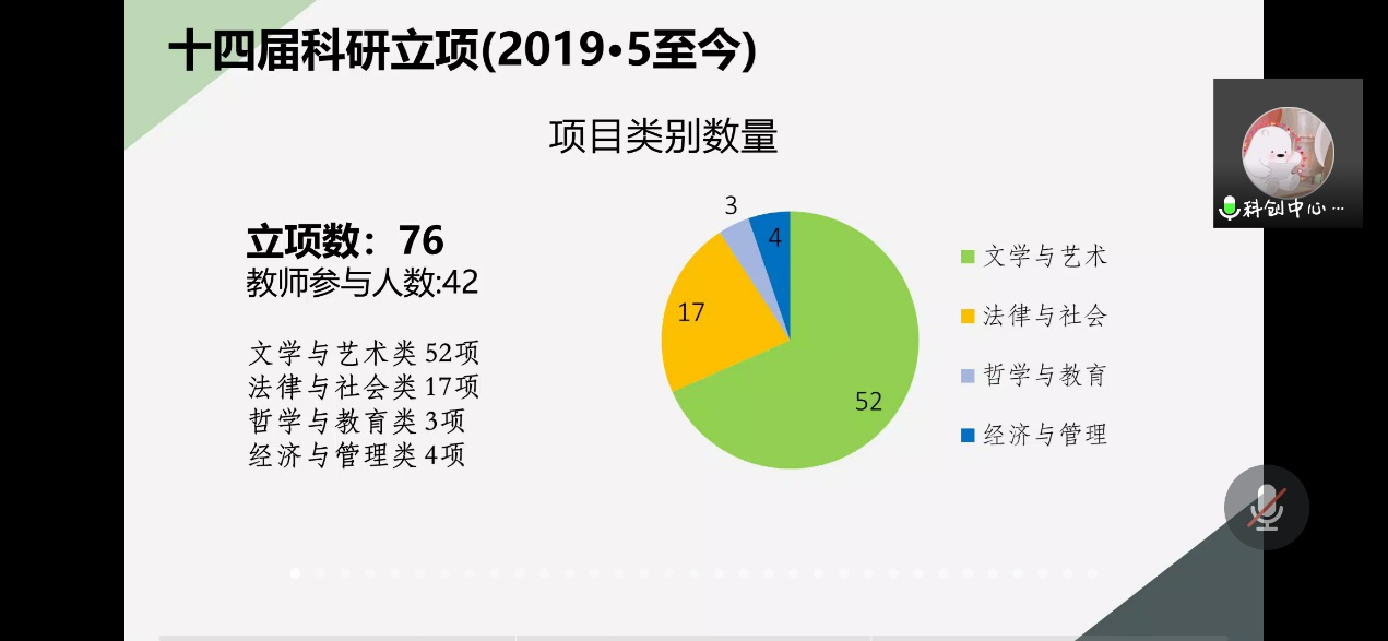 本站讯 5月17日晚,由校团委和pp电子游戏平台官网大学生科技创新中心联合举办的第十三届五四青年科学报告会于腾讯会议线上平台召开。2016级汉语言文学专业周孟琪受邀作为优秀科研代表参加此次报告会,本次会议由周欢主持,参与科研立项申报的所有同学均参加了此次报告会。