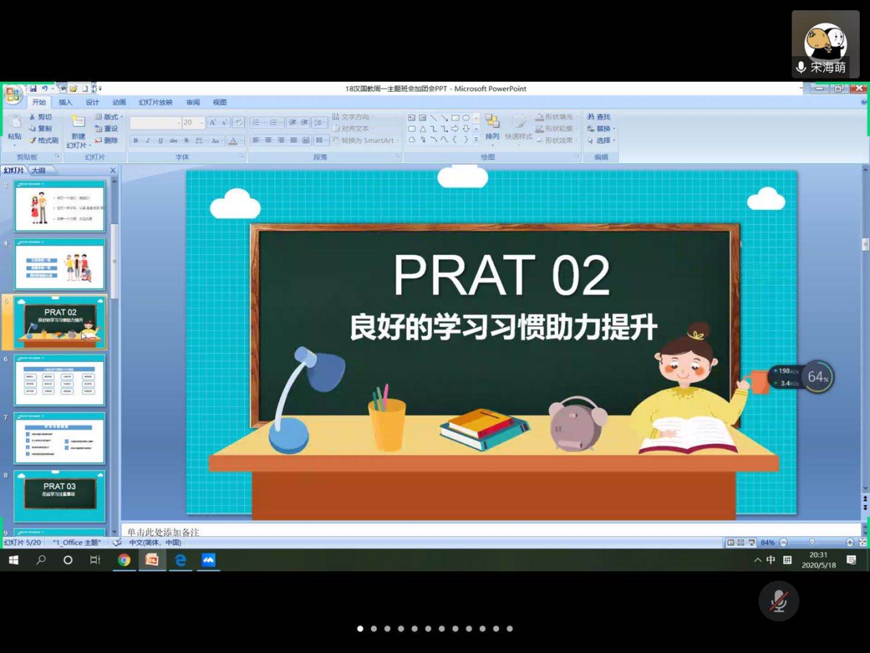 本站讯 5月18日,pp电子游戏平台官网2018级汉语国际教育线上班会在腾讯会议举行。本次班会的主题为“居家分享会”,18级汉语国际教育班长刘晓琳、团支书宋海萌担任主讲人,2018级汉语国际教育全体同学参与班会。