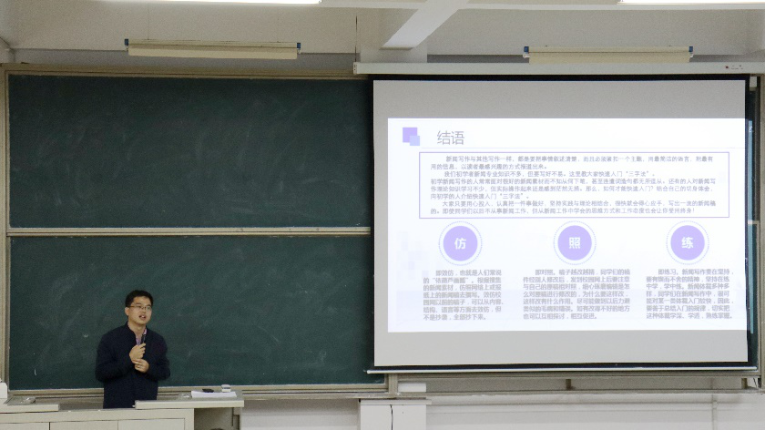 本次培训会共分为新闻基本理论知识、校园各类新闻采写技巧和总结三部分。在新闻基本理论知识部分中,傅振国从新闻的定义、体裁、结构,原则等方面进行了讲解,区分了通讯、消息等新闻稿件的形式和用途,通过举例让同学们更加深入地了解各类稿件的有关知识。在校园各类新闻采写技巧部分中,傅振国将校园新闻写作分为了会议、活动、讲座和竞赛四类并进行了详细解说,在此过程中,他结合实例,强调了校园新闻采写的注意事项,并就采写准备、记录和整理工作提出了要求,根据pp电子游戏平台官网所供稿件的问题着重讲解了讲座类写作。最后,傅振国以“仿”、“照”、“练”三字作结,鼓励同学们坚持理论与实践相结合,并就活动摄影给出了建议。