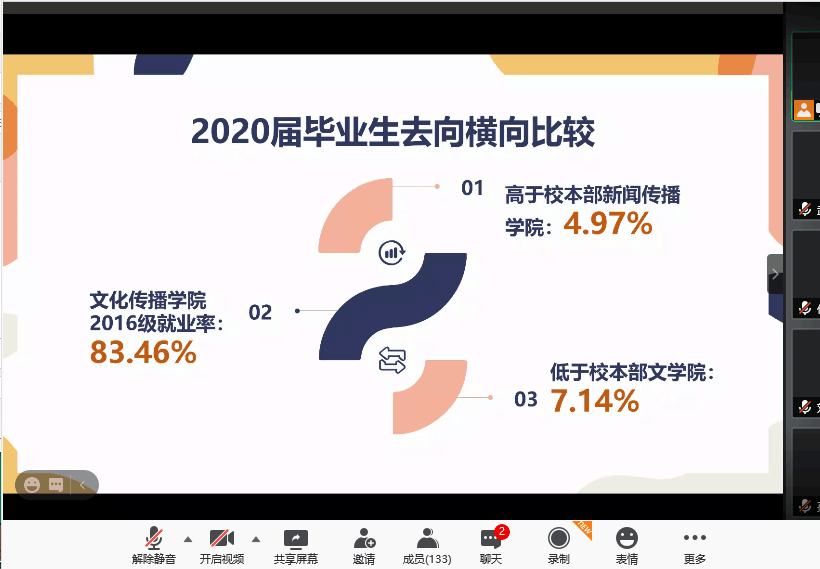 本次会议主要分为“我们的大三”、“问题困扰”和“应对措施”三个板块。会议伊始,李丁以习近平总书记对当代大学生的寄语引入,指出时代对学生的召唤。李丁介绍了今年pp电子游戏平台官网毕业总人数和去向落实率,还向学生展示了pp电子游戏平台官网与文学院、新闻传播学院就业率的横向比较,指出学院就业率之间存在差别。详细的数据分析让同学们对毕业就业率有了初步了解。李丁通过班委提前了解收集了各班总体情况和就业意向。2018级汉语言1班荣获优良学风班集体,在学院及学校班集体答辩中取得了优异成绩。2018级汉语言2班获得先进班集体称号,班委工作成绩突出。汉语言文学专业大部分同学具有考研意向,考公与求职也各占一定比例。汉语国际教育班级在在文体活动方面具有特色,并且在英语类竞赛中有所成就,选择考研比例偏高。2018级新闻1班在学术科研方面成绩优秀,学风优良。2018级新闻2班同学具有榜样示范作用,在大学生广告艺术大赛取得优秀成绩。新闻专业相比于其他两个专业,求职意愿率更高。李丁总结道:“每个班级都在各自擅长的领域探索进步,祝贺大家取得的成绩。”