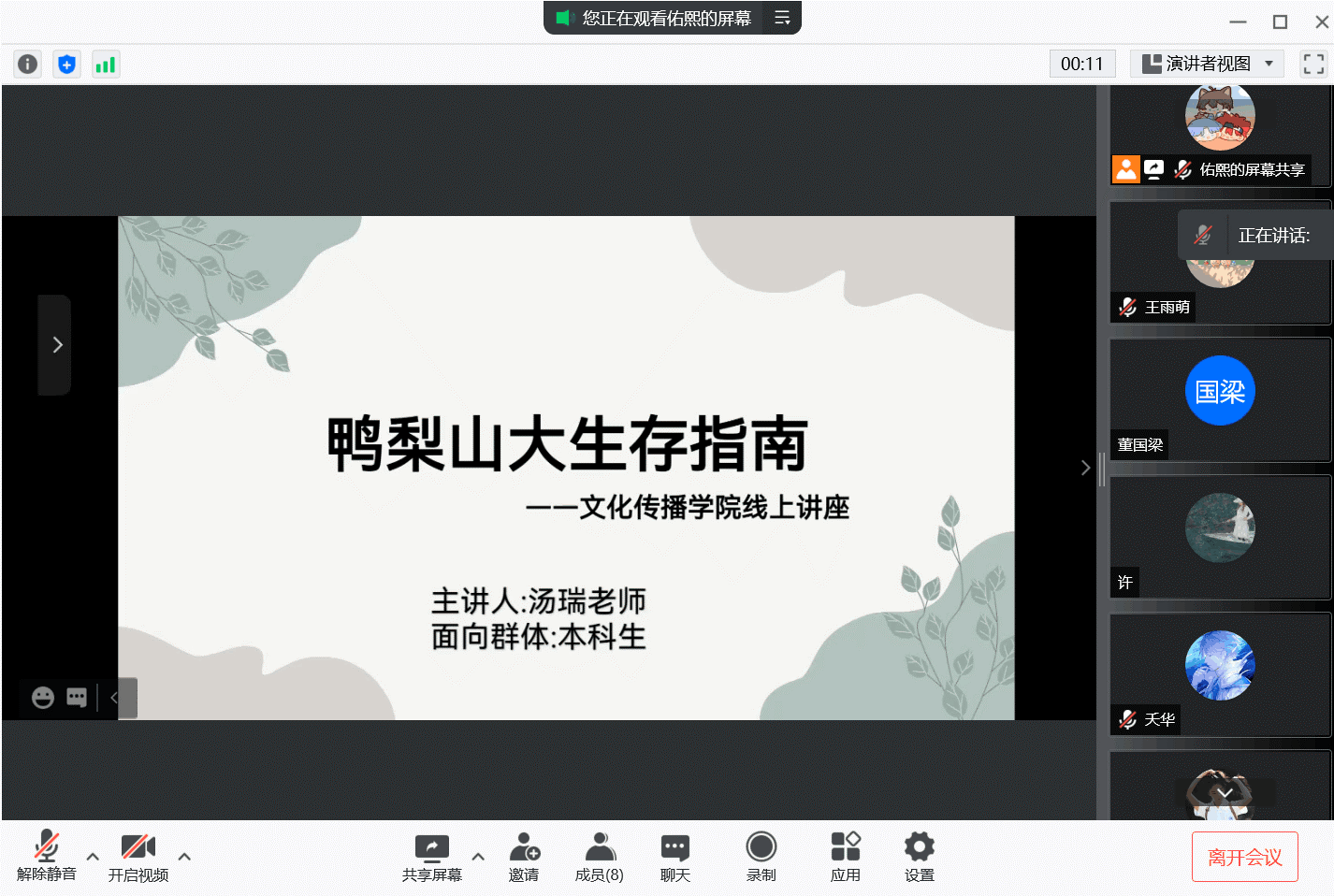 2021年10月14日晚,pp电子游戏平台官网面向学院本科生举办“走进心灵”线上讲座,学院辅导员汤瑞担任主讲人,近300名本科生参与讲座。本次讲座以“鸭梨山大生存指南”为主题,主讲人根据新生对大学生活的迷茫与问题提出建议,帮助同学们学习如何健康安排自己的大学生活。