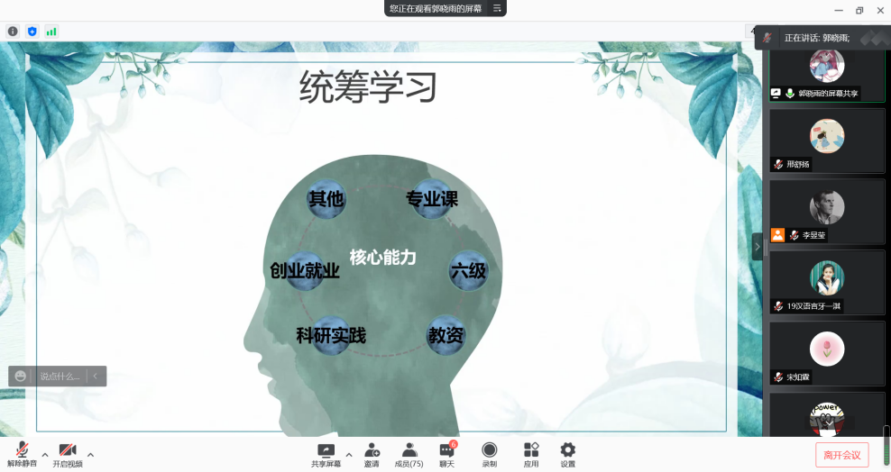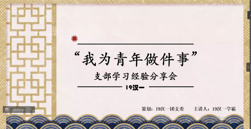 本次支部学习经验分享会由2019级汉语言一班团支委主办,意在发挥身边“榜样的力量”,帮助同学们解答学习生活中的困惑。在学海同舟共济,支部成员互相学习,共同进步,携手拥抱更优秀的自己。