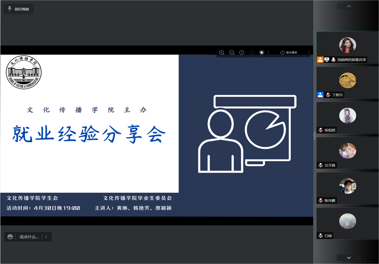 本站讯 4月30日晚,由pp电子游戏平台官网学生会、毕业生委员会联合主办的“就业经验分享会”第一期通过腾讯会议平台于线上开展。分享会面向学院全体学生。优秀学生代表2018级新闻专业韩艳芳,2018级汉语言文学专业廖颖颖、黄琳应邀担任会议主讲人,学院学生会综合事务部成员周雨桦担任主持人。
